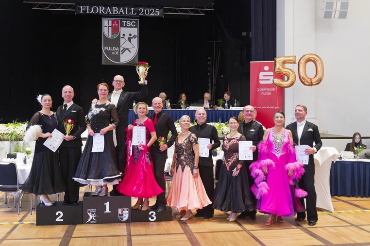An Allerheiligen nahmen Friederike und Franz Gerhard Borengässer in der Master III B Standard am 50. Florapokal des TSC Fulda teil. Dem edlen Ambiente der der 300 Jahre alten Orangerie hatten die fleißigen Helfer des TSC zusätzliche Eleganz eingehaucht und die Turnierstätte schon auf den abendlichen Floraball vorbereitet. Vor voll besetztem Haus zogen Friederike und Franz Gerhard mit voller Kreuzzahl souverän in das sechspaarige Finale ein. Hier konnten sie alle Tänze für sich entscheiden und dieses traditionsreiche Turnier klar gewinnen. Die Siegerpokale waren sehr dekorativ mit frischen Blumen gefüllt. Bemerkenswert außerdem: Der Ehrenvorsitzende des TSC, Franz Mahr, führte mit seinen 91 Jahren – wohl als einer der ältestend aktiven Turnierleiter in Deutschland – souverän durch die Wettkämpfe und hat nichts von seinem Esprit verloren.