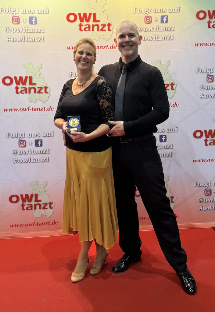Unser Paar Eva und Christoph Gerth tanzen seit knapp 4 Monaten im Turniersport Standard der Master II D. Am Samstag waren sie bei dem Masters II D Turnier 2. (von 7 Paaren) und haben das Masters 1 D gewonnen (8 Paare). Daher durften sie abends das Masters 1 C Turnier mittanzen, wo sie 6. von 10 geworden sind. Am Sonntag konnten sie im zweiten Masters 2 D Turnier mit dem 2. Platz von 8 die letzten Punkte für den Aufstieg sammeln. Im nachfolgenden 2 C Turnier belegten sie Platz 6 von 15.